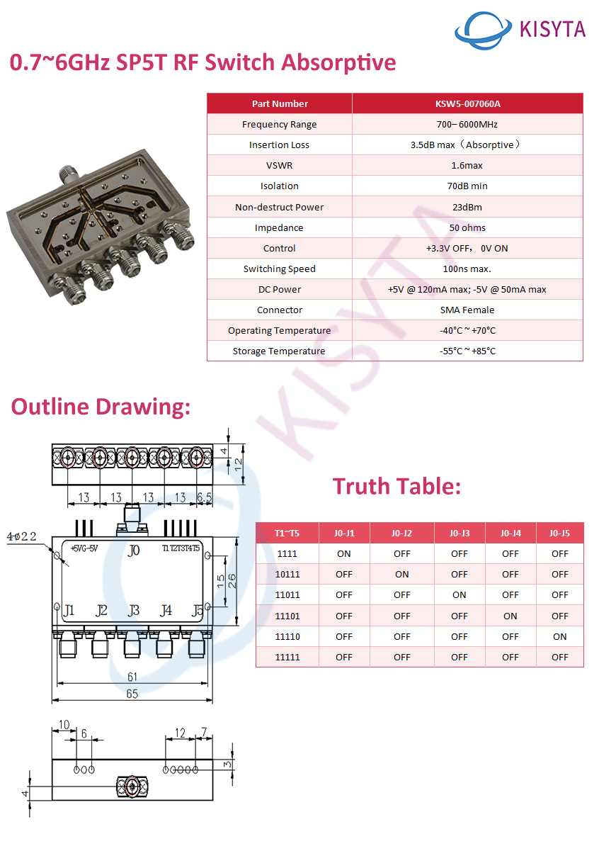 0.7~6GHz SP5T RF Switch Absorptive KSW5-007060A