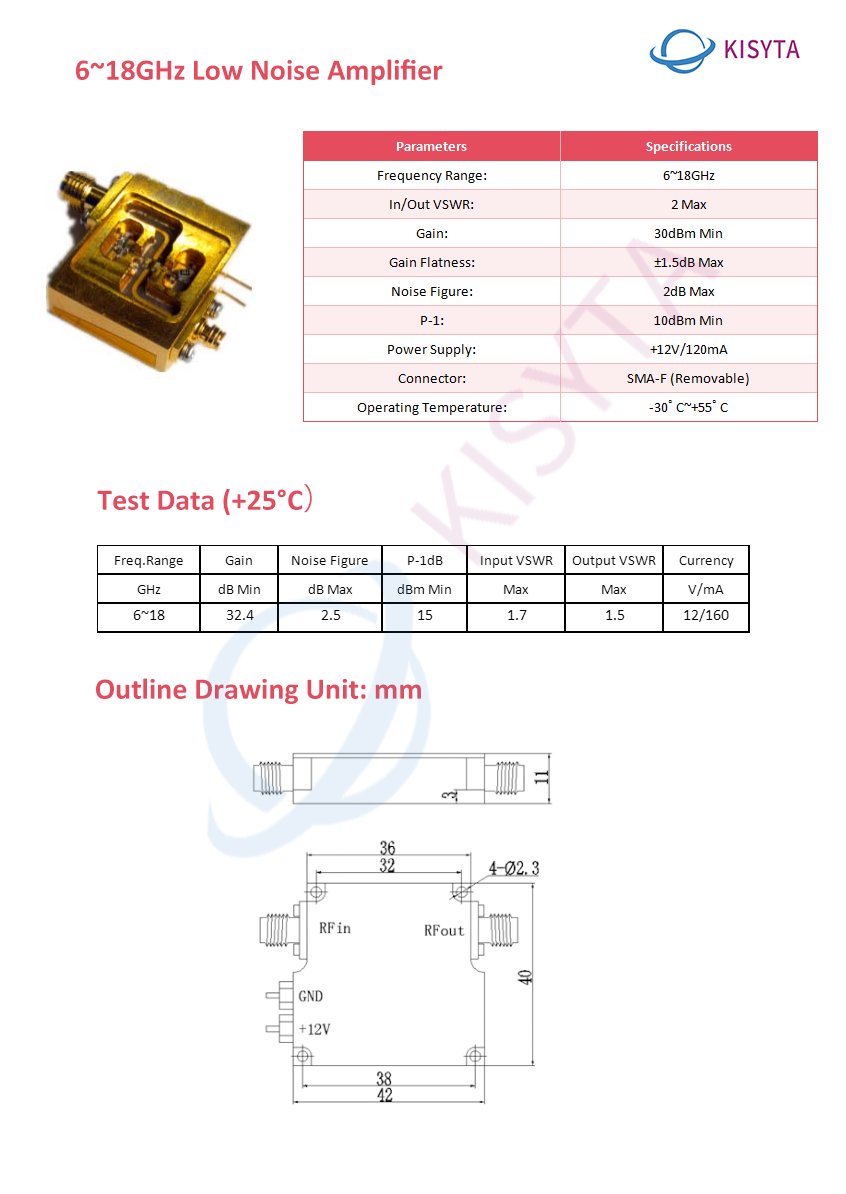 6~18GHz Low Noise Amplifier KLNA060180G30P10